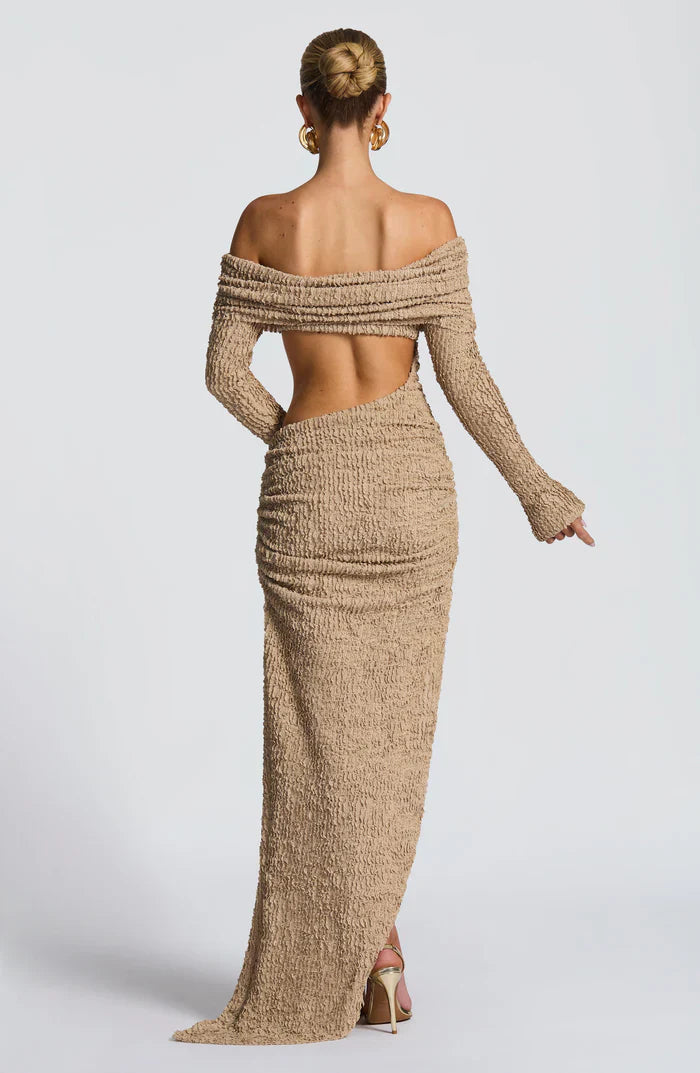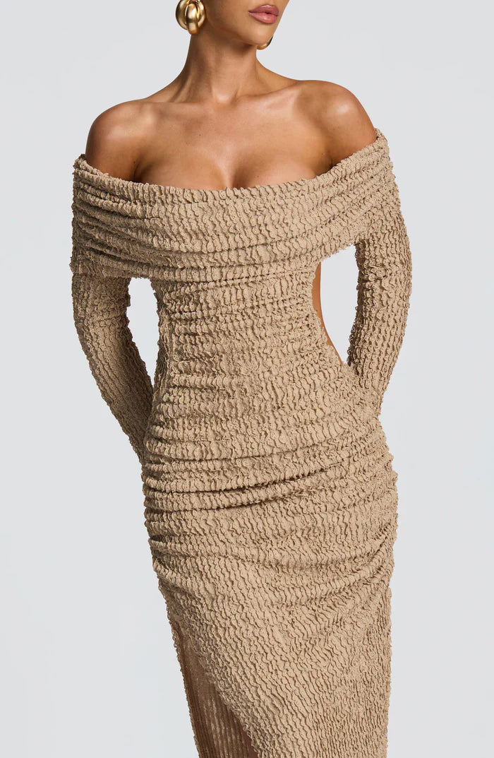 The Adelphia Midi Dress features a textured cut-and-sew fabric with a sophisticated Bardot neckline and long sleeves finished with flared cuffs. Elegant ruching shapes the bodice, while subtle cut-outs on the left side and back add a modern edge. The asymmetric skirt enhances its refined silhouette.