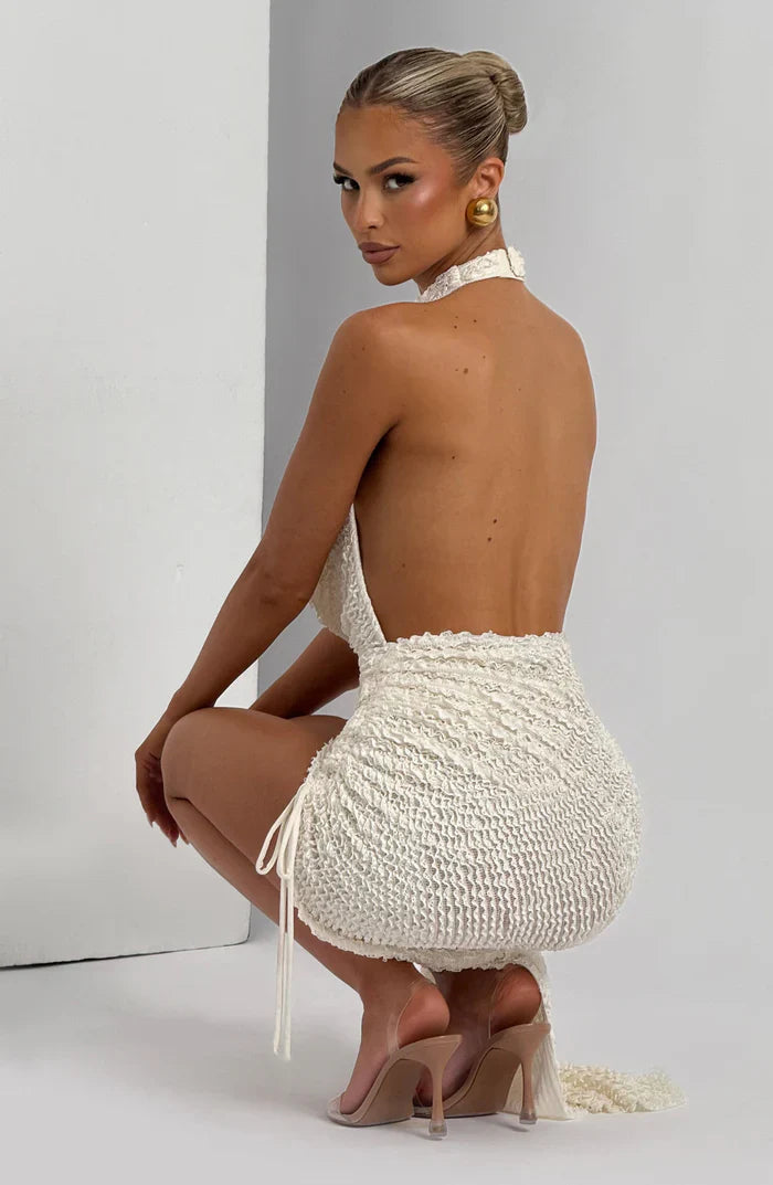 Get ready to turn heads in the Airla Midi Dress! The textured cut and sew fabric creates a unique look, while the plunging cowl neckline adds a touch of playfulness. Embrace your bold side with the backless design and show off your curves in the asymmetric midi skirt with tight ruching detail.