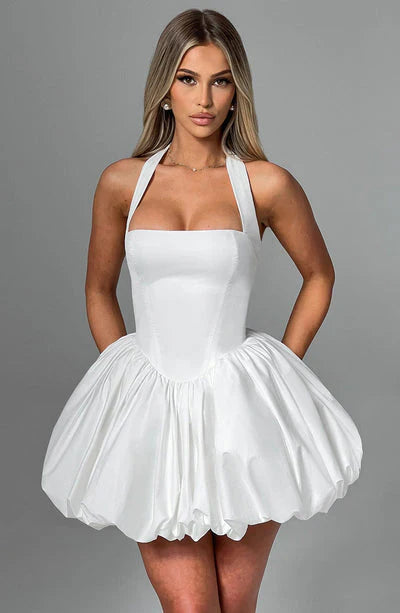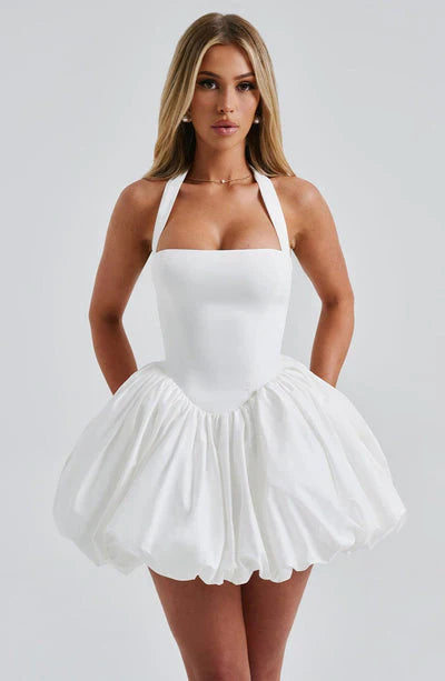 Designed to steal the spotlight, the Arielle Mini Dress is a playful, sculpted silhouette with undeniable drama. Crafted from structured fabric, it features a bold bubble skirt that flares from a fitted halter bodice, creating a striking hourglass shape. Elegant yet daring, this piece is made for standout moments.