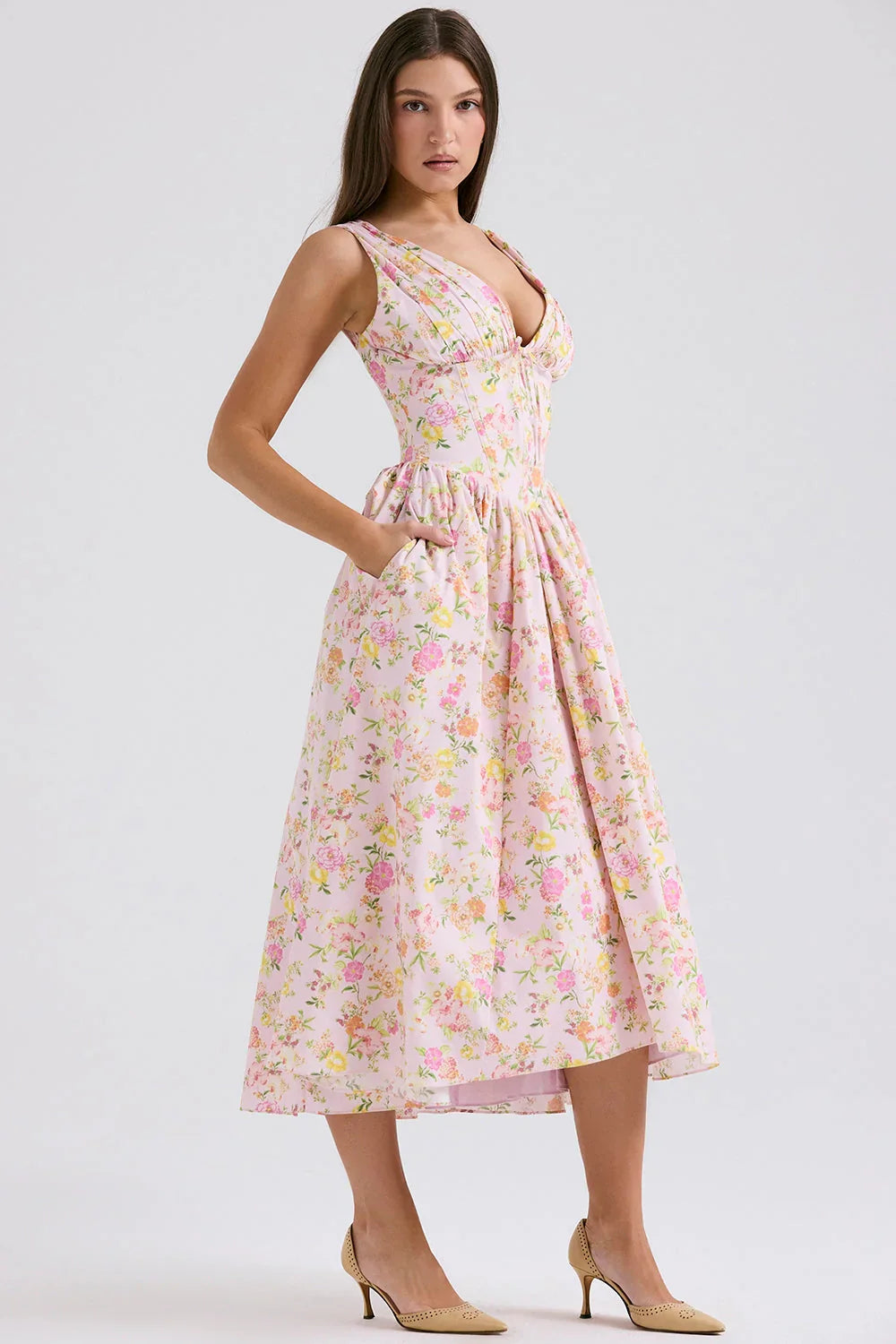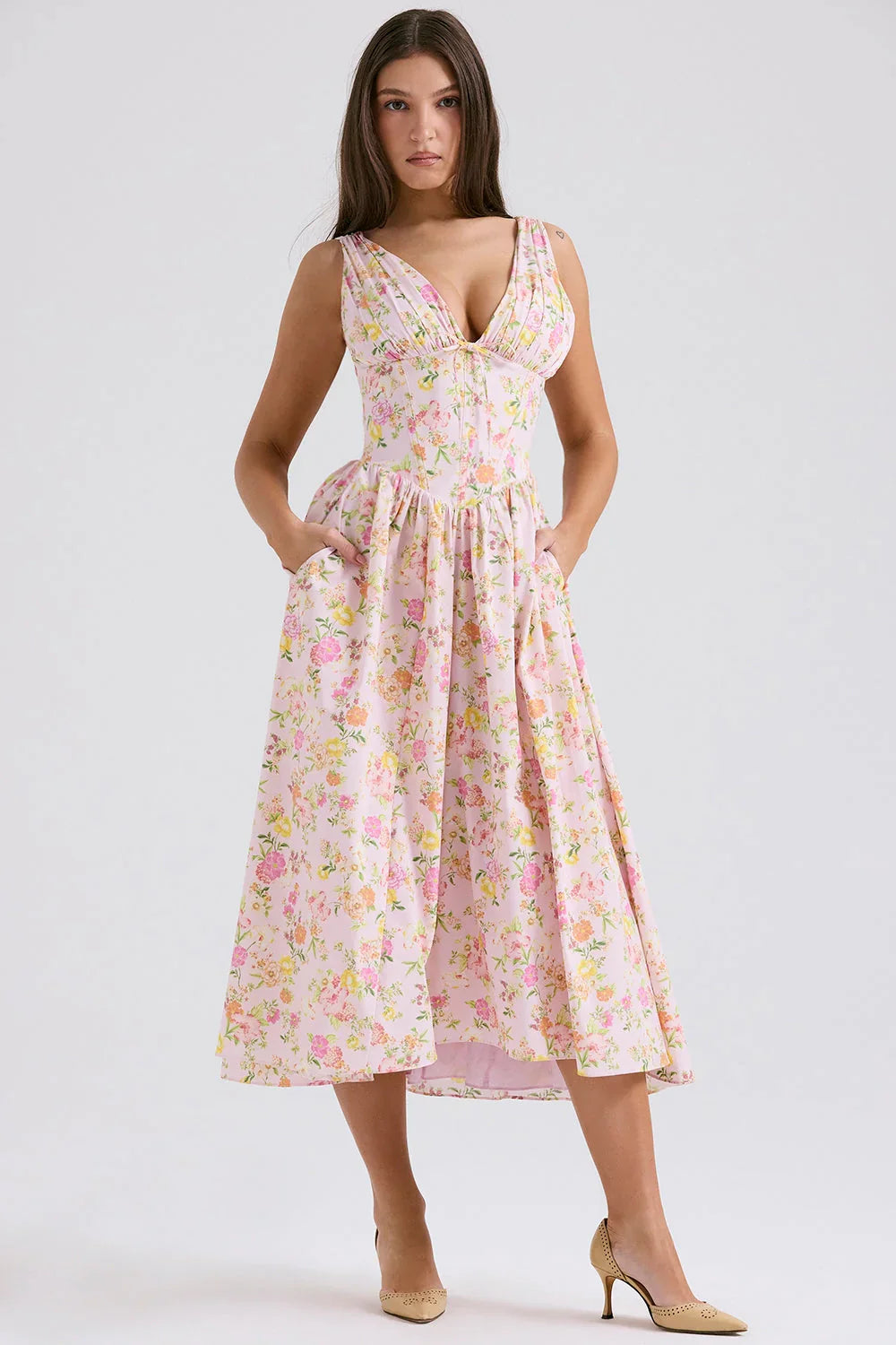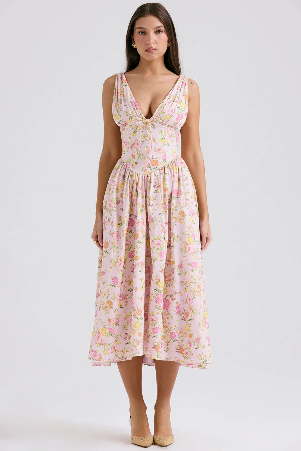 Channeling understated elegance, the Crystal Midi Dress is an effortless wear-anywhere piece in a crisp white hue. Cut from stretch cotton-rich fabric, it features a gathered bust, plunging neckline, and open back. The corseted bodice flatters the waist, while the floaty skirt adds graceful movement with every step.