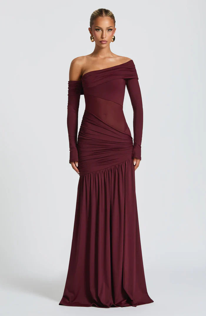 Indulge in luxury with our Ettalie Maxi Dress. Made from a stretch slinky fabric, it features an elegant sheer mesh panel on the bodice and an asymmetric neckline. The ruched detail on the hip adds a touch of sophistication, while the full, gathered skirt adds drama to the long sleeves with gently flared cuffs.