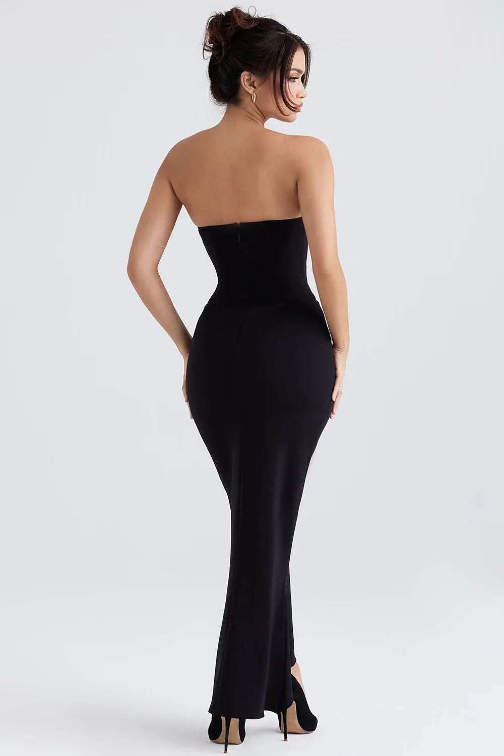 Elevate your evening wear with the Janai Maxi Dress, crafted from a luxurious blend of stretch crepe and silky satin. Featuring a strapless, boned bodice that cinches the waist, it creates a sophisticated silhouette perfect for glamorous occasions.