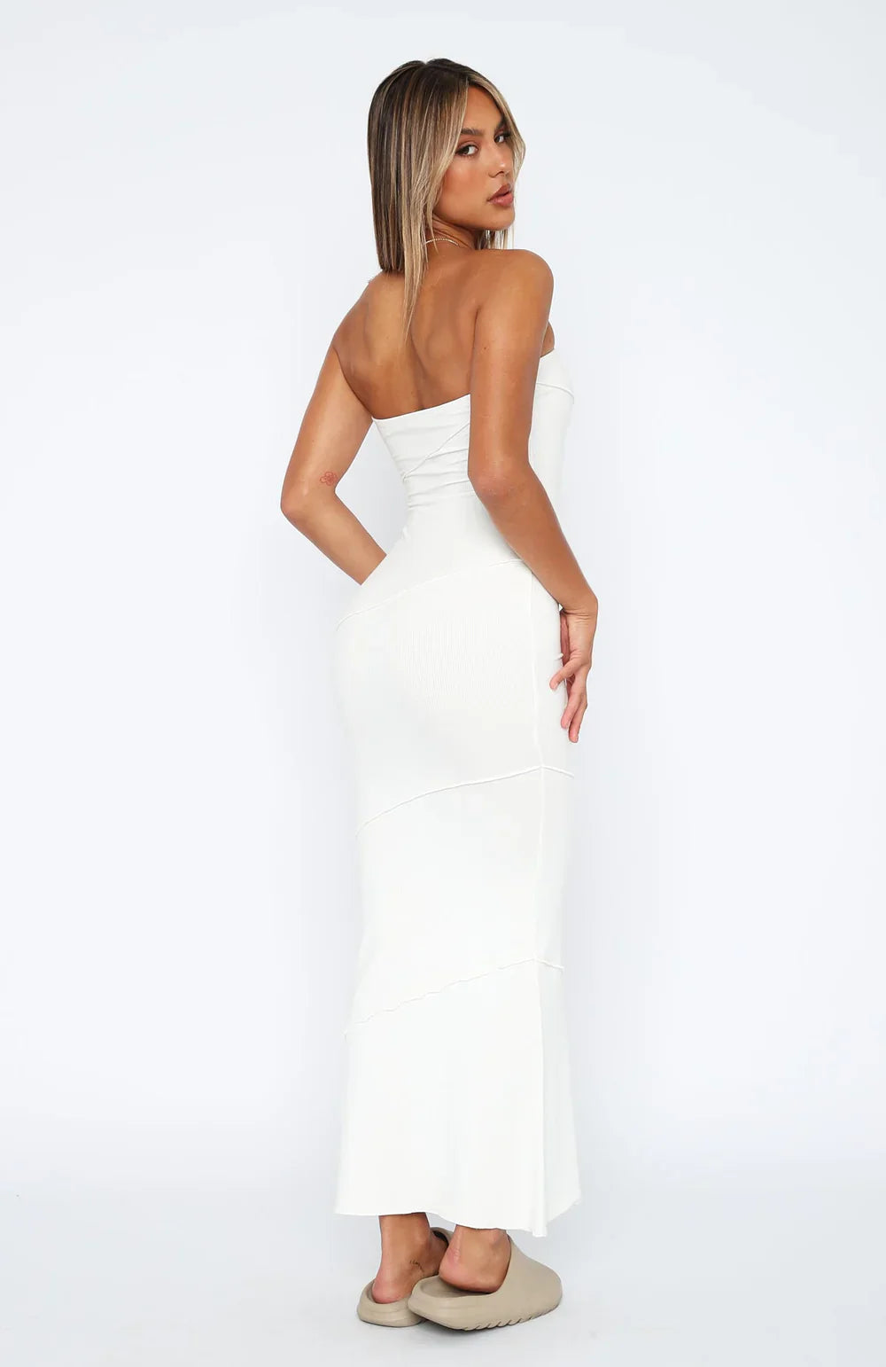 Meet the ultimate statement piece — the Not So Basic White Body-Con Maxi Dress. This strapless dress is crafted from thick ribbed stretch fabric with secure grip tape for a flawless fit. Fully lined and designed to hug your curves, it features a discreet side zipper and a sleek silhouette perfect for day or night.