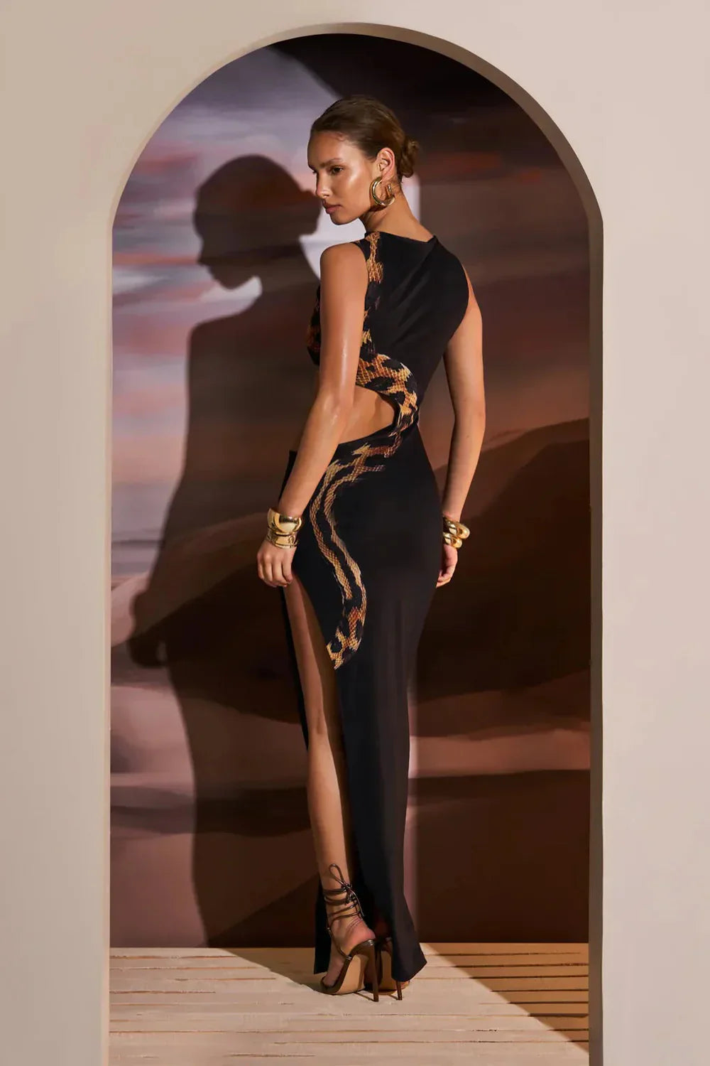 Step out in style with the Kingsley Viper Dress, a striking bodycon maxi designed to turn heads. Featuring a daring cut-out bodice, slash neckline, and thigh-high side split, this sleeveless dress showcases a unique in-house snake print layered over mesh. Crafted from medium-stretch, bra-friendly fabric, it combines edgy design with comfortable fit.