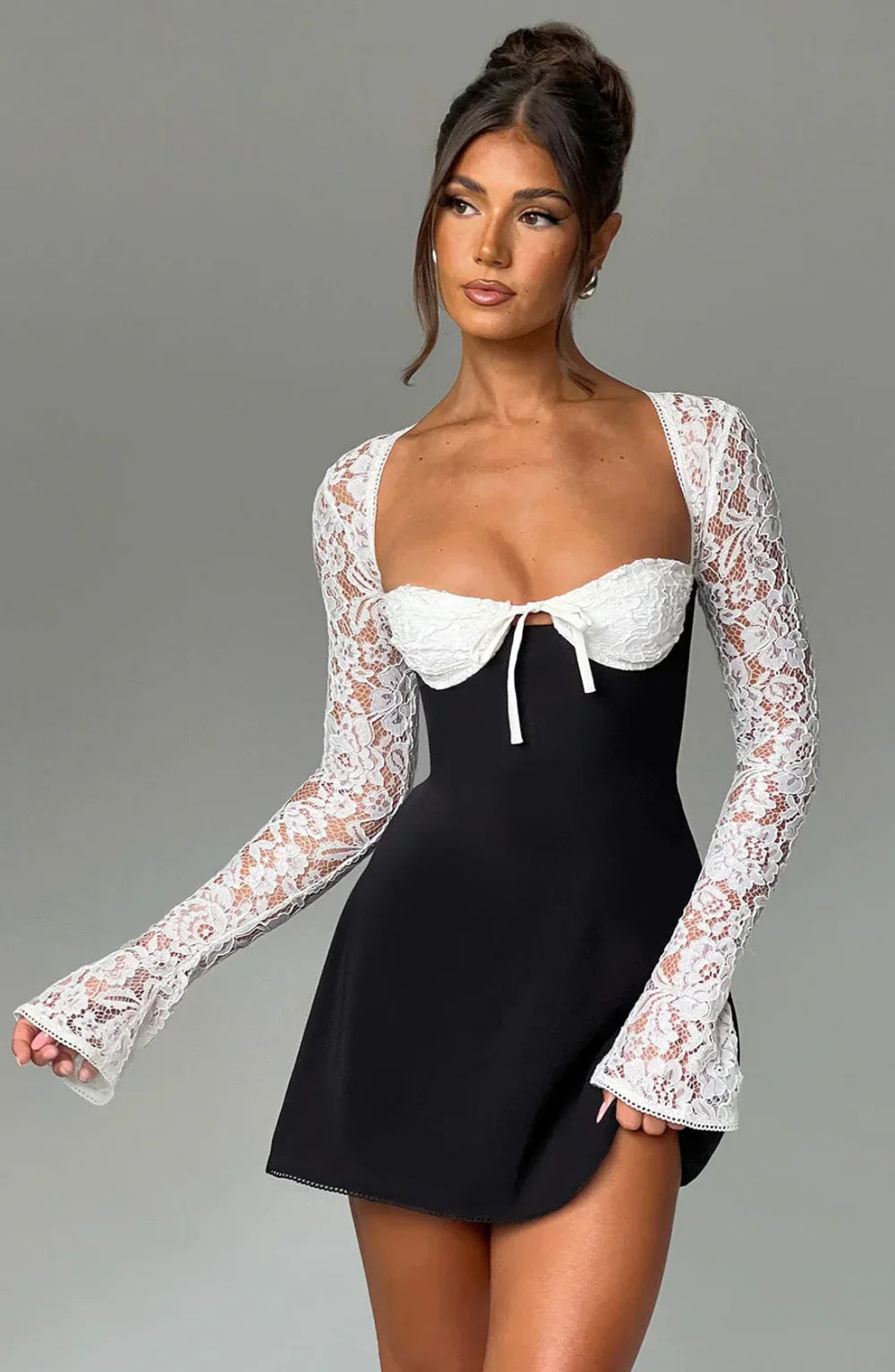 Channel timeless elegance with the Liza Lace Mini Dress, crafted from luxurious chiffon and lined with soft satin. Featuring long sheer lace sleeves, a structured bodice, and lace-up back with adjustable tie detail, it flatters your figure with feminine charm.