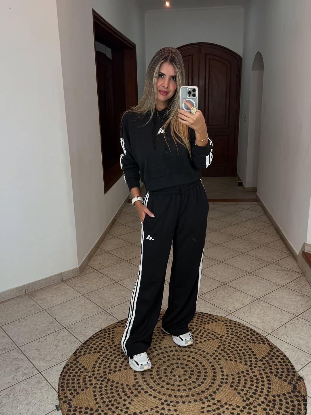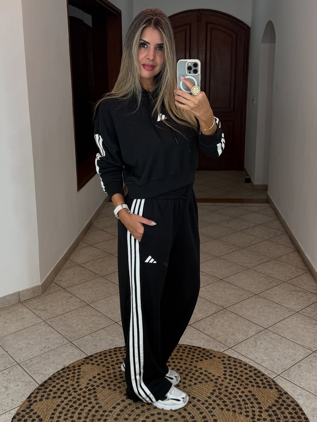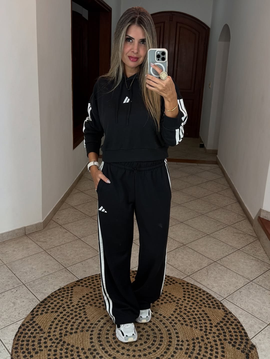 Featuring a sleek black cropped hoodie with a modern logo and full-length trousers with iconic side stripes, this look offers a relaxed fit and timeless streetwear charm. The perfect choice for laid-back days or active routines in style.