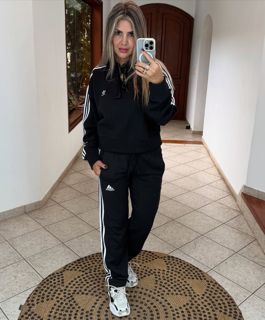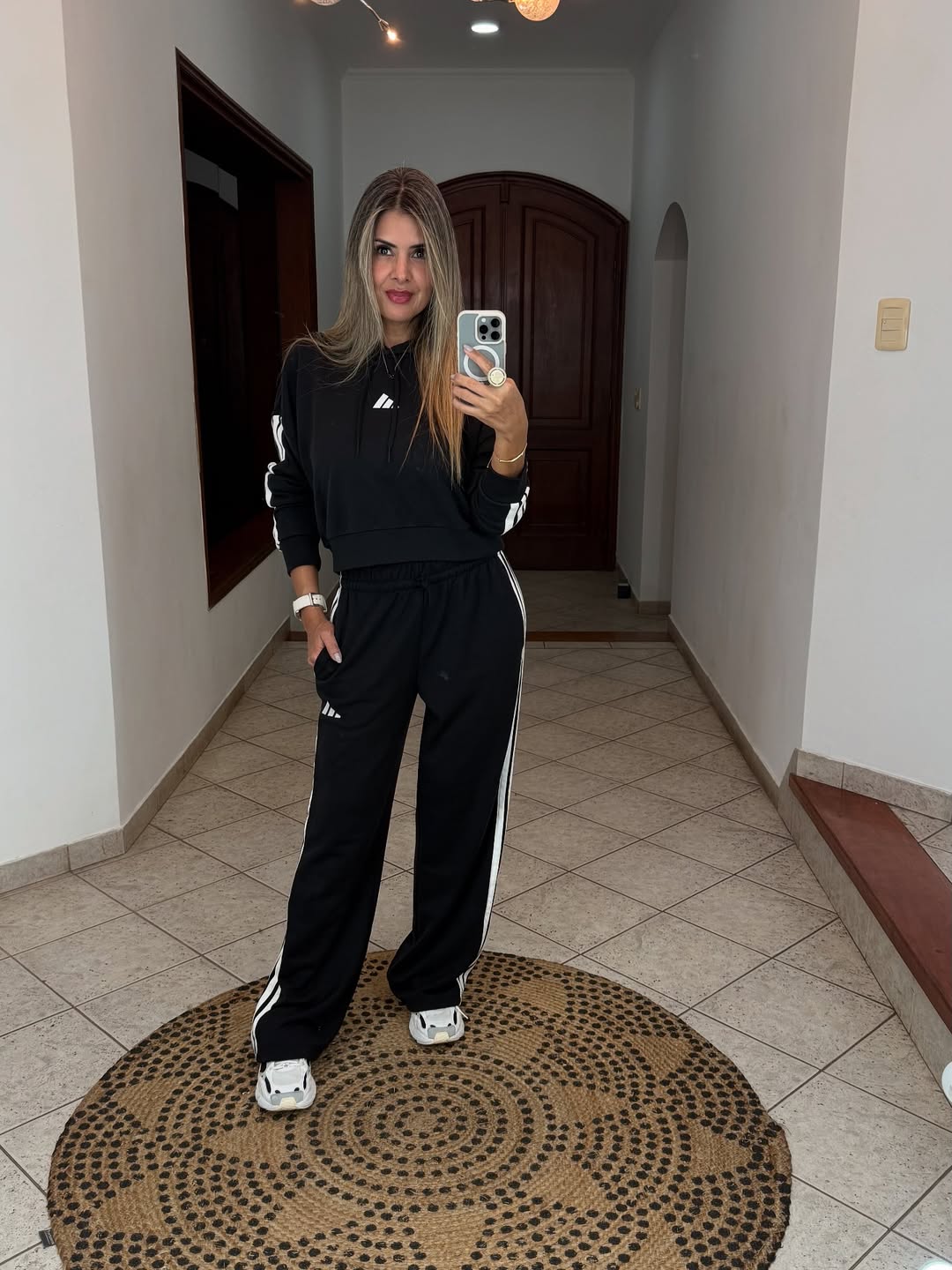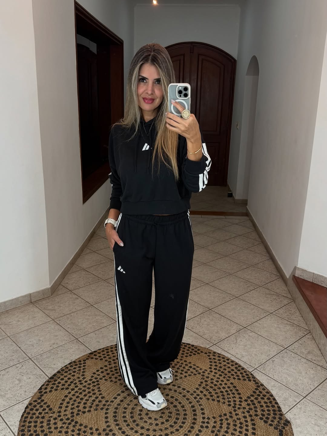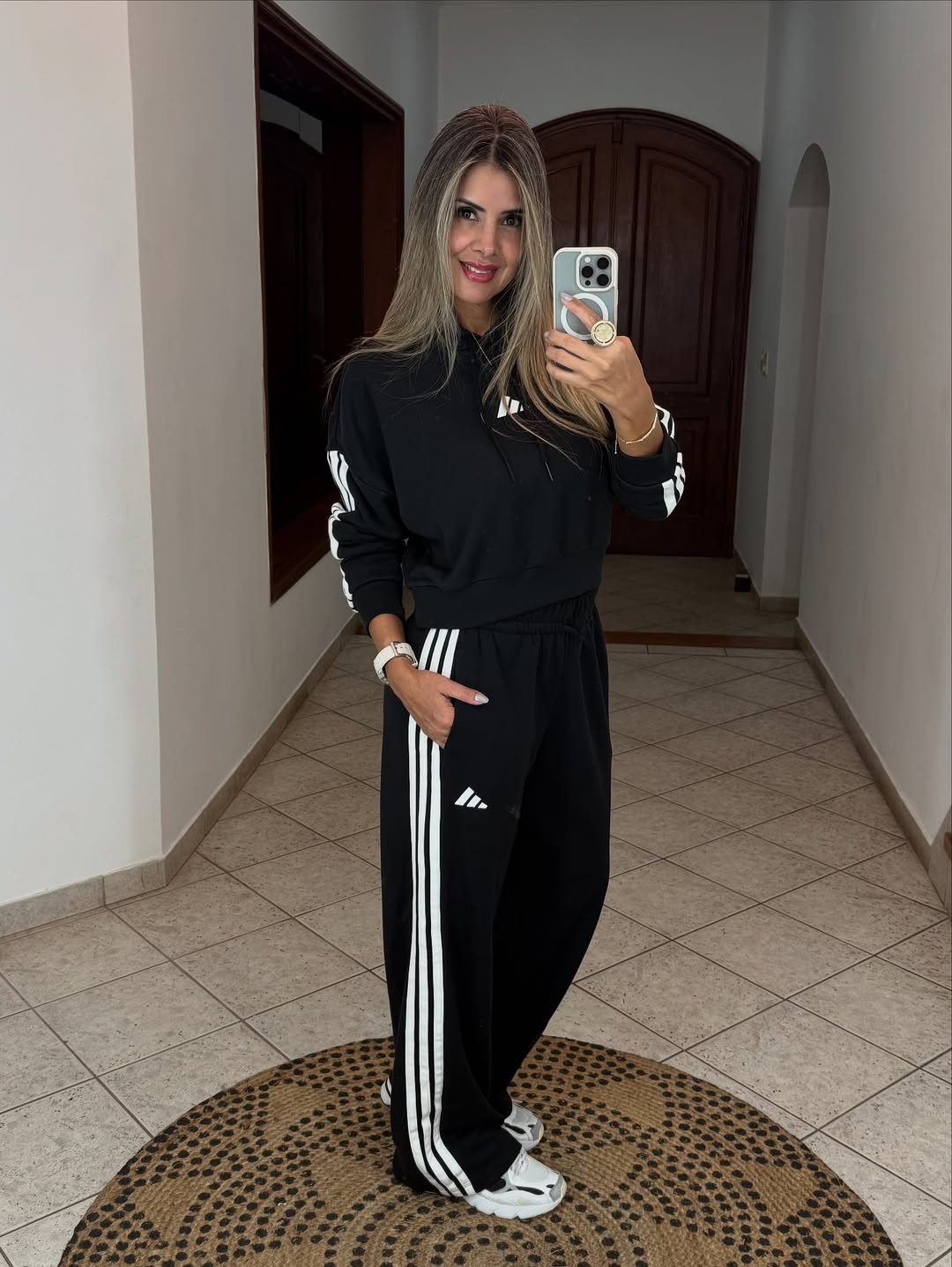 Featuring a sleek black cropped hoodie with a modern logo and full-length trousers with iconic side stripes, this look offers a relaxed fit and timeless streetwear charm. The perfect choice for laid-back days or active routines in style.