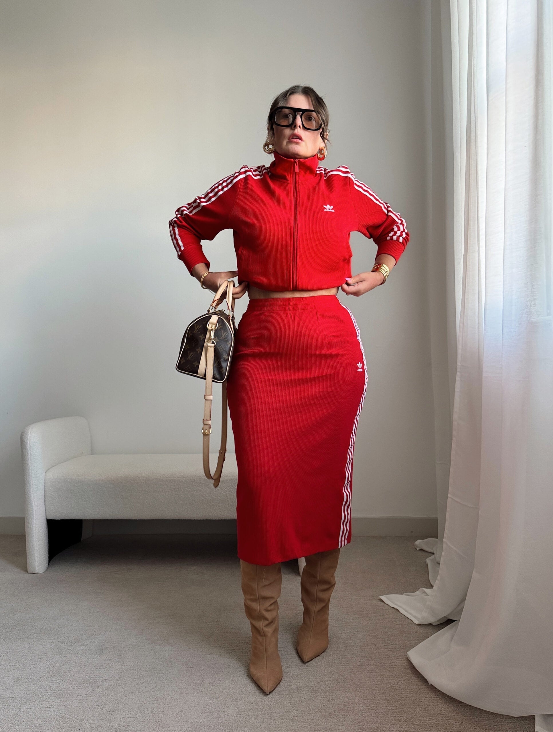 Stand out – without saying a word. The Originals Scarlet Ribbed™ Skirt Set combines bold colour, structured comfort, and urban street-chic in a single look.