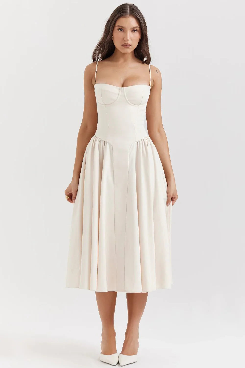 Penelope is your perfect all-season dress. Crafted from breathable twill fabric, it features boning through the bodice to cinch the waist and a sweetheart neckline with underwired cups. Barely-there adjustable straps and gathered detailing add feminine volume to the midi skirt.