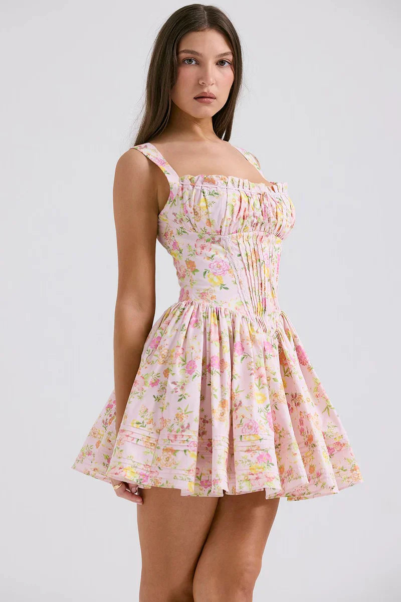 Introducing the Rhea Mini Dress, the ultimate expression of romance and timeless style. Crafted from stretch cotton-rich fabric, it features delicate pin-tuck details, a softly gathered bust with dainty ties, and a voluminous mini skirt that floats effortlessly. The back zipper ensures a seamless fit.
