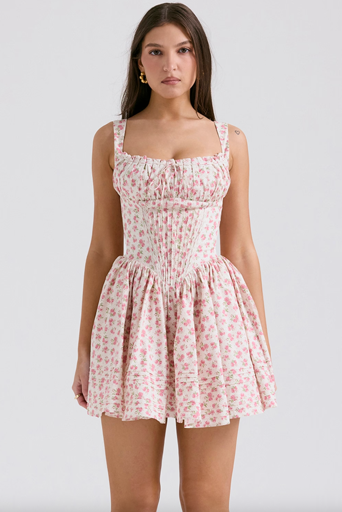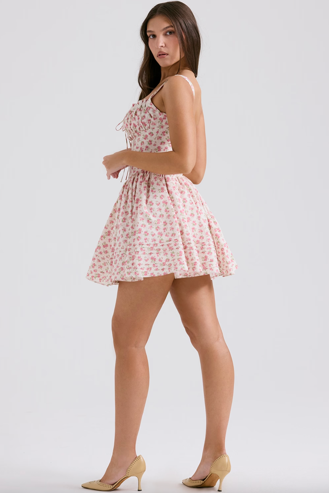 Introducing the Rhea Mini Dress, the ultimate expression of romance and timeless style. Crafted from stretch cotton-rich fabric, it features delicate pin-tuck details, a softly gathered bust with dainty ties, and a voluminous mini skirt that floats effortlessly. The back zipper ensures a seamless fit.
