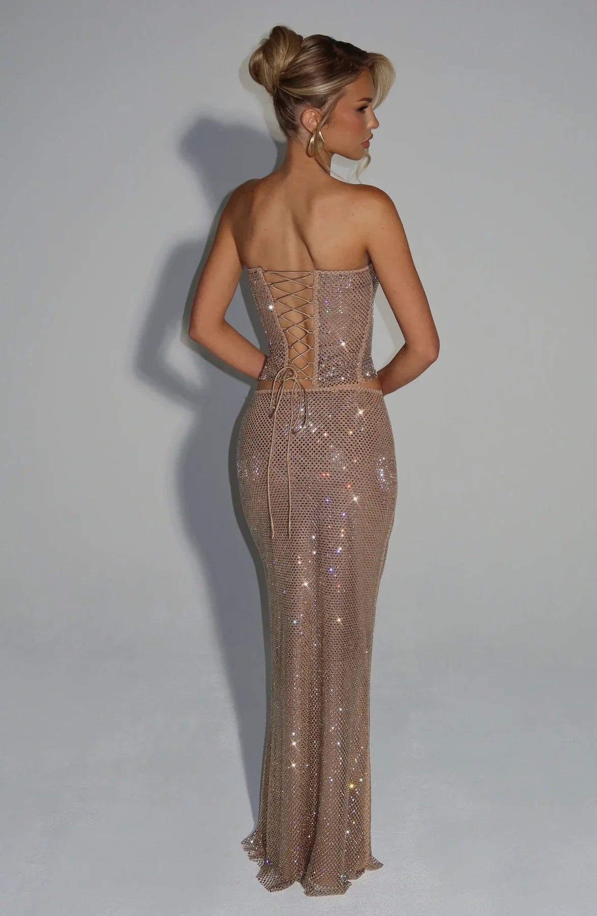 The Serena Top in gold features a strapless neckline and a delicate stretch net fabric adorned with square hotfix rhinestones. Its lace-up back with satin ties offers an elegant, adjustable fit, perfect for a refined and glamorous look.