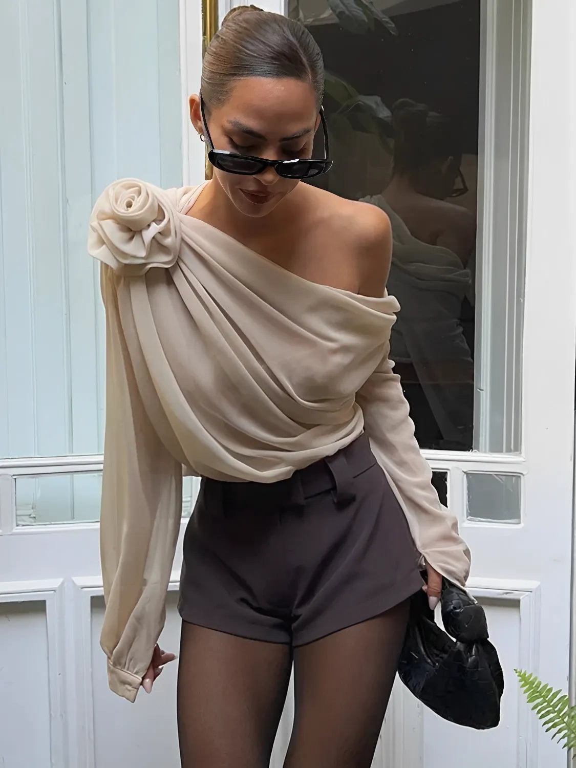 ✔ 1 Blusa Feminina de Ombro Único com Flor em Chiffon